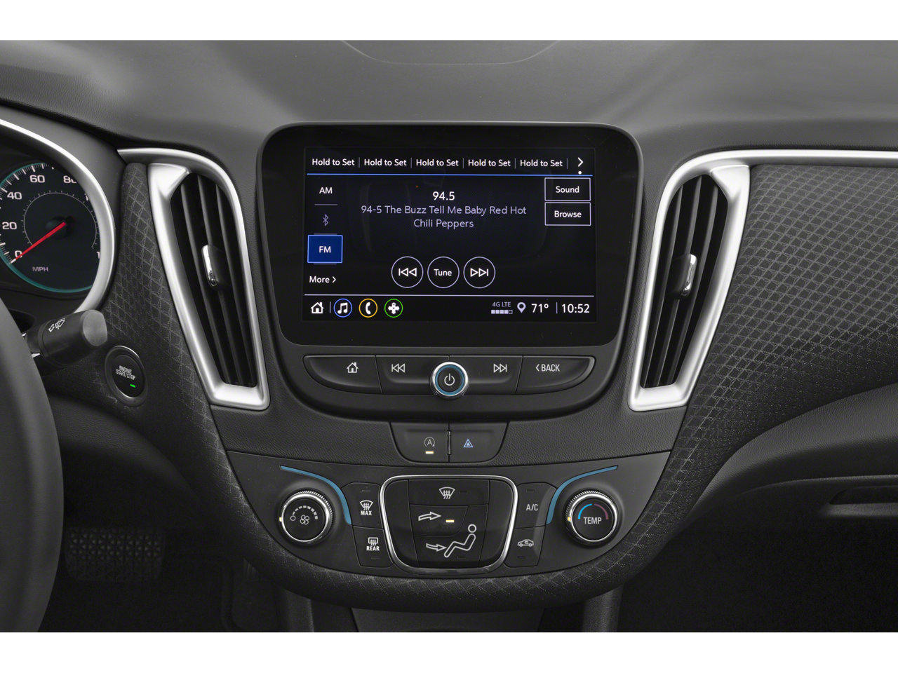 - Audio system, Chevrolet Infotainment 3 system, 8" diagonal color touchscreen, AM/FM stereo. Additional features for compatible phones include: Bluetooth® audio streaming for 2 active devices, voice command pass-through to phone, Apple CarPlay and Android Auto capable.